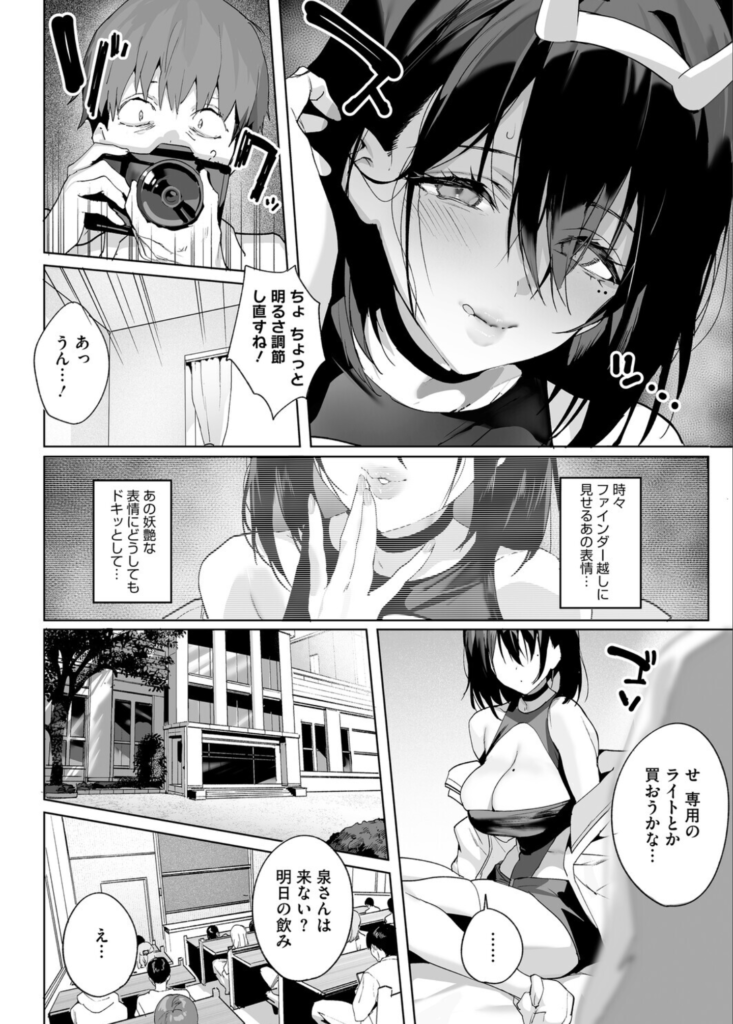 特に注目すべきは、泉さんの心境の変化です。最初の頃は純粋に撮影を楽しんでいたはずの関係が、次第に彼女の衣装が過激さを増し、ポージングの一つ一つが「誘い」の色を帯びていきます。「いったい彼女は何を考えているんだろう……」という主人公の戸惑いは、まさに読者が抱く期待そのもの。コスプレという「マスク(仮面)」を被ることで、普段は言えない彼女の本音が、露出した肌と湿った瞳から溢れ出す瞬間こそが、本作最大の盛り上がりと言えるでしょう。