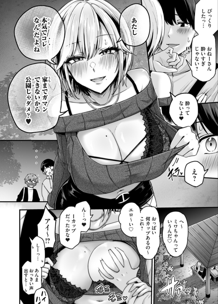 特筆すべきは、公園の東屋で行われる濃厚な3P・4Pのシチュエーションです。緊張する大学生の肉棒をフェラで手懐け、自慢の長乳で包み込むパイズリ。その最中にもう一人の男に手マンで弄られ、口移しの酎ハイディープキスで喉を潤す……。五感の全てをセックスに捧げた巳羽の姿は、まさに淫魔。mirudora先生の真骨頂である、汗と愛液が滴るような肉感的な作画が、彼女の「欲望の解放」をこれ以上ないほど鮮烈に描き出しています。