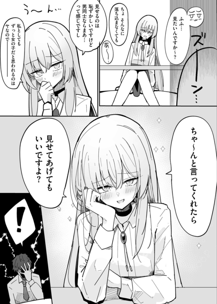 「そんなわけがない。こんなに可愛い子が男なはずがない」。竹本の脳内は笹木さんのことで埋め尽くされ、ついには彼女(彼)の股間にちんこがついている夢まで見る始末。下着越しでもいいから、その「有無」を確認したい。その好奇心と情欲が爆発したとき、二人の関係は「お隣さん」の一線を越え、アナルセックスという未知の領域へと踏み出していくのです。果たして、笹木さんの足の間に隠されていた「真実」とは――!?
